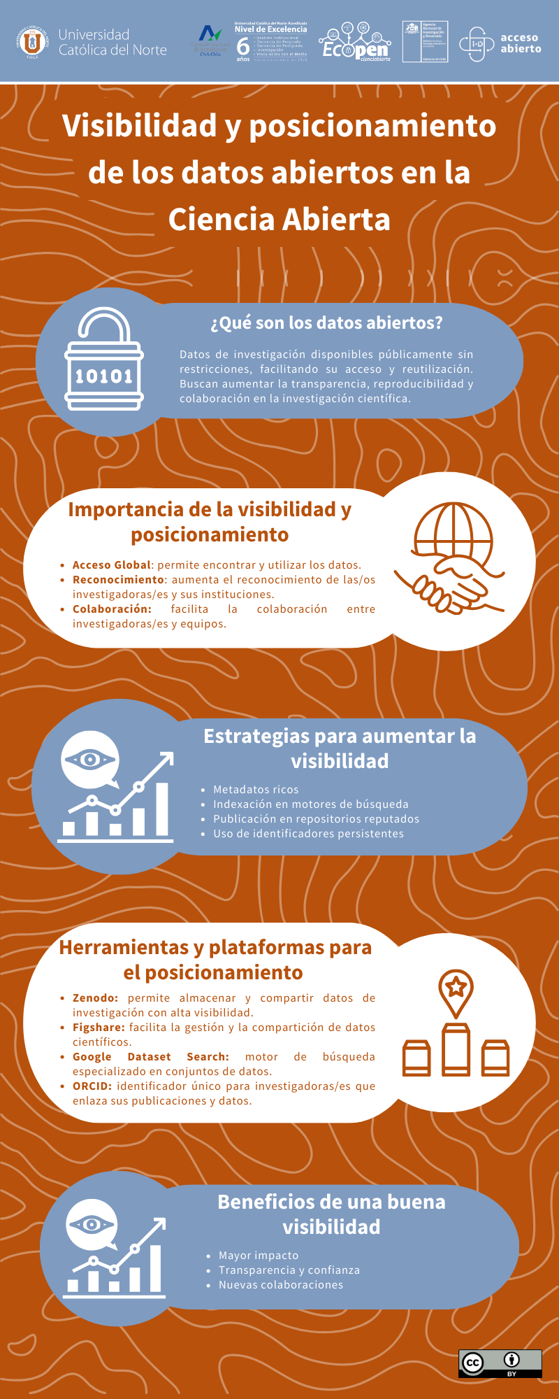 La visibilidad de los datos abiertos es esencial para potenciar su uso, impacto y proyección colaborativa. Para fortalecer su posicionamiento, se pueden implementar acciones como difundirlos en repositorios de prestigio, aplicar estrategias de marketing digital, desarrollar aplicaciones que los integren y utilizar recursos de diseño gráfico que faciliten su comunicación.